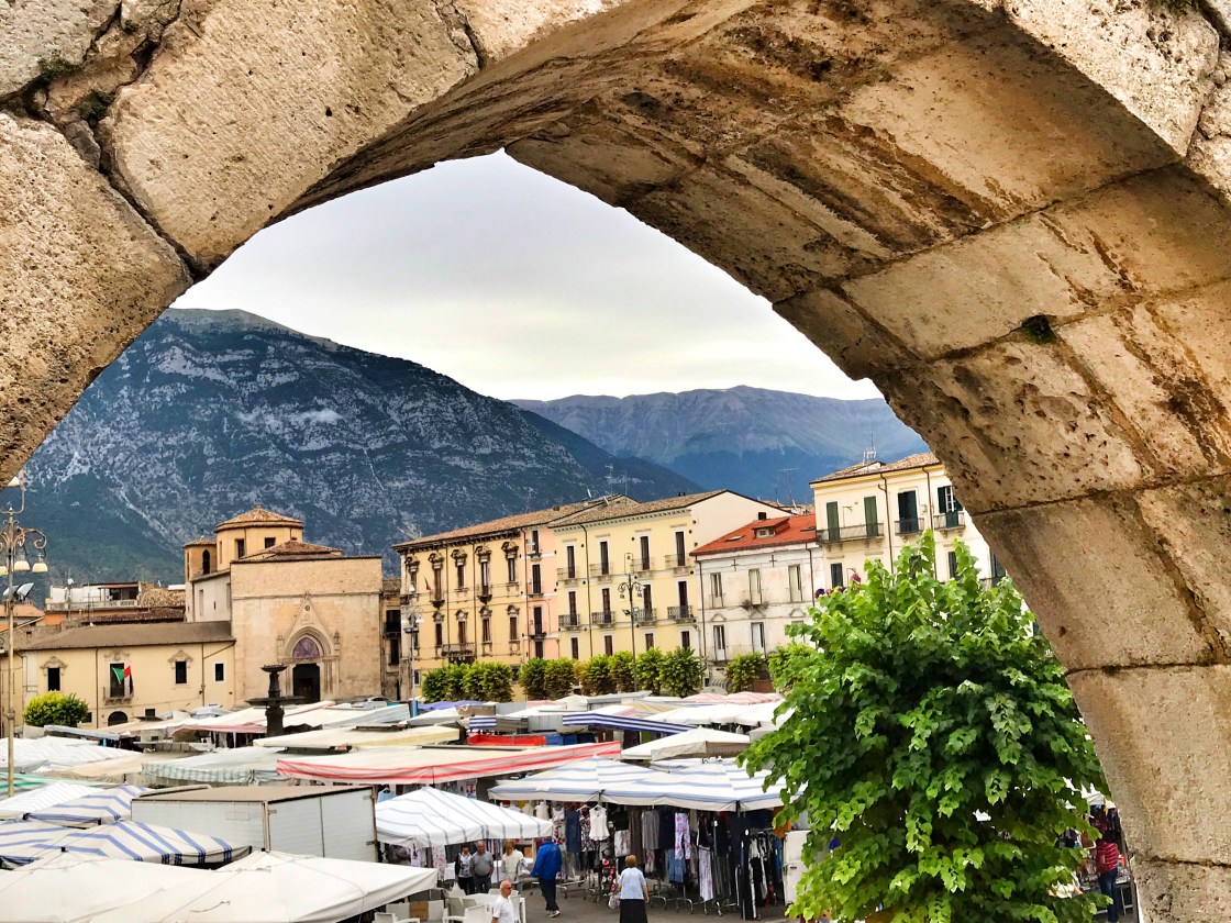 Sulmona, which holds its market in Piazza Garibaldi, has one of my favorite markets because that market has everything. I bought a chitarra there last year because I want to use it to make pasta. I could have bought one in the States, but this one was only 10 euro and not $40-70, and some Italian guy made it. I like that. I also like the porchetta (por-KET-a) at the Sulmona market. Porchetta is roast pork that is simply to die for.
