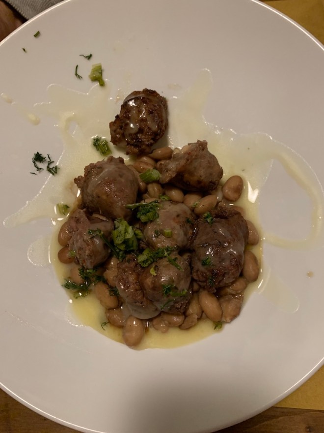 Ed had sausage and beans over potato puree. I had debated that and bowed out because I love cauliflower. Oops.