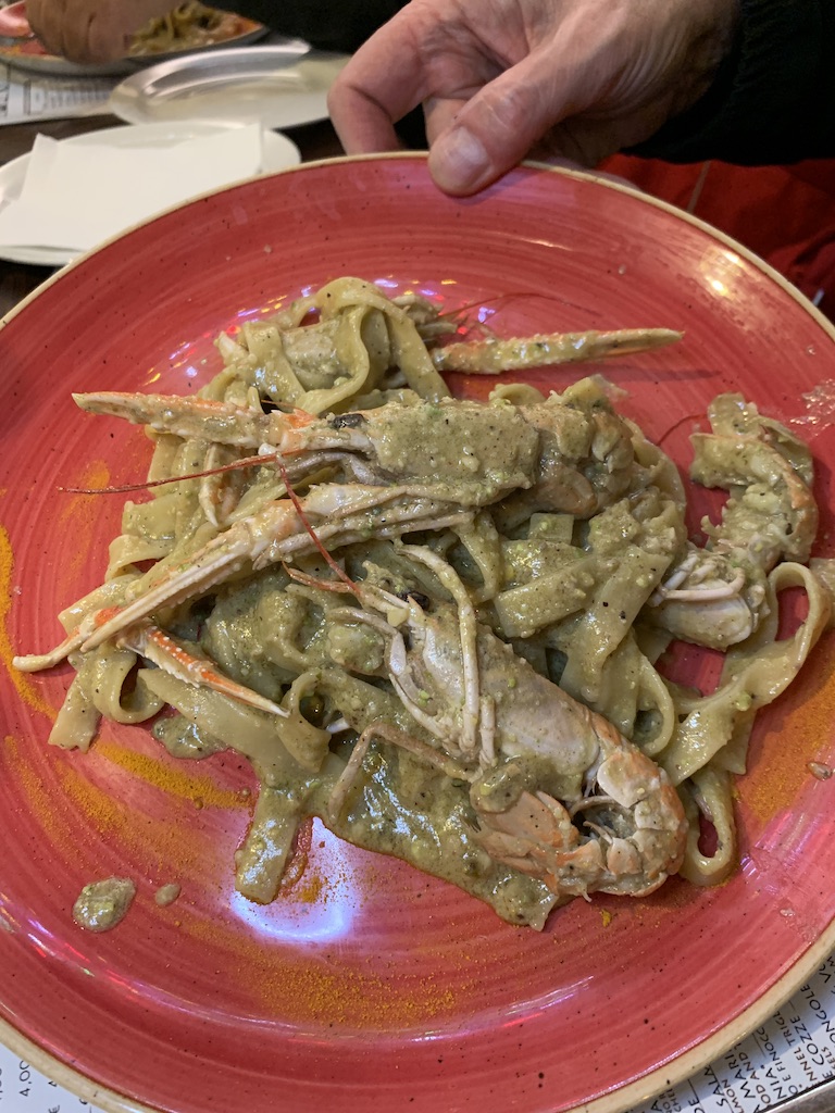 ….the pasta. We had a specialty of the night at Antica Birreria the night everyone arrived, the fettuccine with pistachio pesto. Mine was plain (above), and the guys ordered theirs with shrimp (below). In addition to the less-than-appetizing look (Believe me; the cheese saved this photo.), the taste wasn’t great, and the guys didn’t like fighting with their shrimp