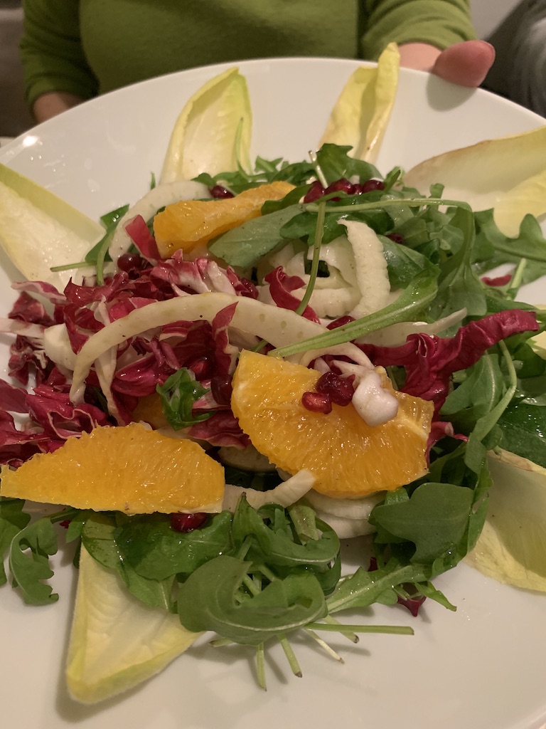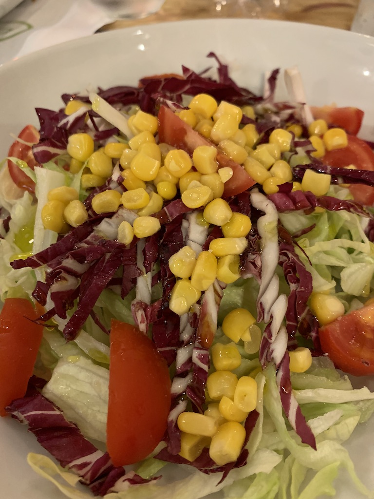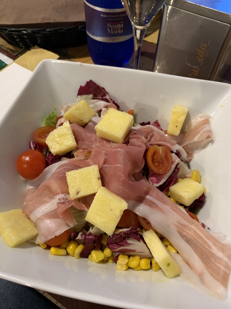 We had some pretty good salads, and I didn’t see rocket (arugula) anywhere. Note that two of them have corn (normal), and all three have radicchio (which they can eliminate for me). I liked the one I had tonight with pineapple and prosciutto (far right).