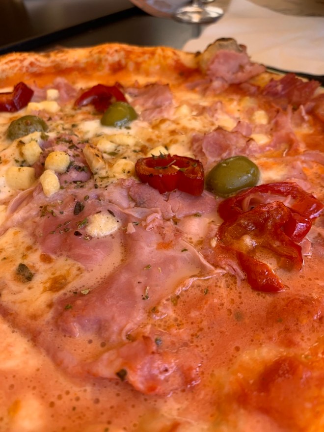 Speaking of that pizza, we got it at Antica Pizzeria Guglielmo in Monreale, a small place behind the duomo. Gary had a four cheese pizza, and Kathy and Ed tried one with ham. Rob and I ventured a little out of the box and had the one with green olives, red peppers, ham, provola, and peccorino romana cheese.