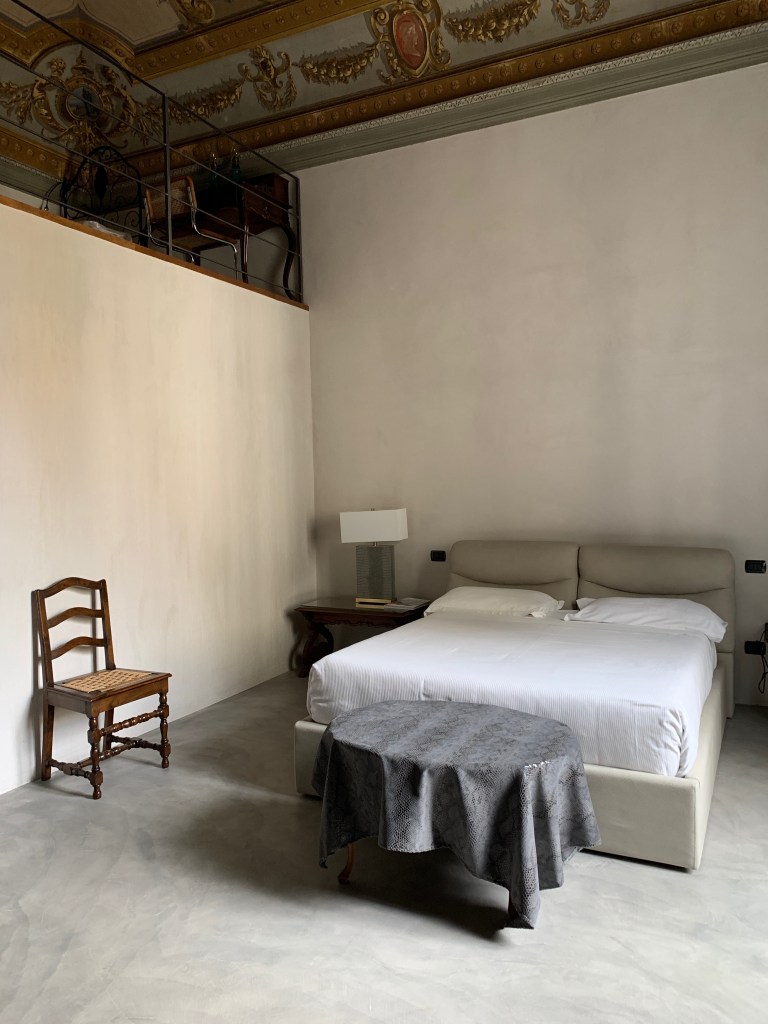 The Austro-Hungarian Embassy when Florence was the capital of Italy, the apartment where we’re staying in is a grand place with original frescoes still on the ceilings. There are five bedrooms and five bathrooms, kitchen, living room, dining room, and terraces. Everything is updated—stove, oven, bathrooms, and the floor.