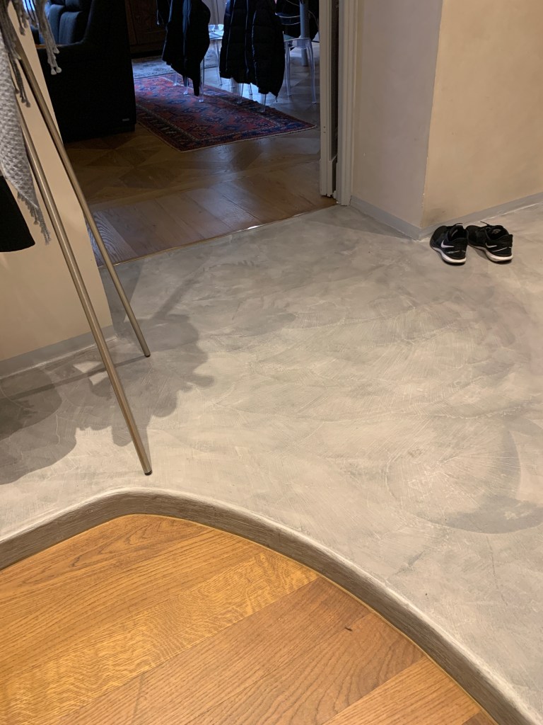 I mentioned that when they renovated this place, they fixed everything, including the floor. If you look at the photo on the left below, you can see the stained cement floor in the hallway, and the parquet flooring in one of the rooms. If you look at the photo on the right, you can see that inside the door, the concrete floor is about four-to-five inches higher than the foyer’s wood floor.