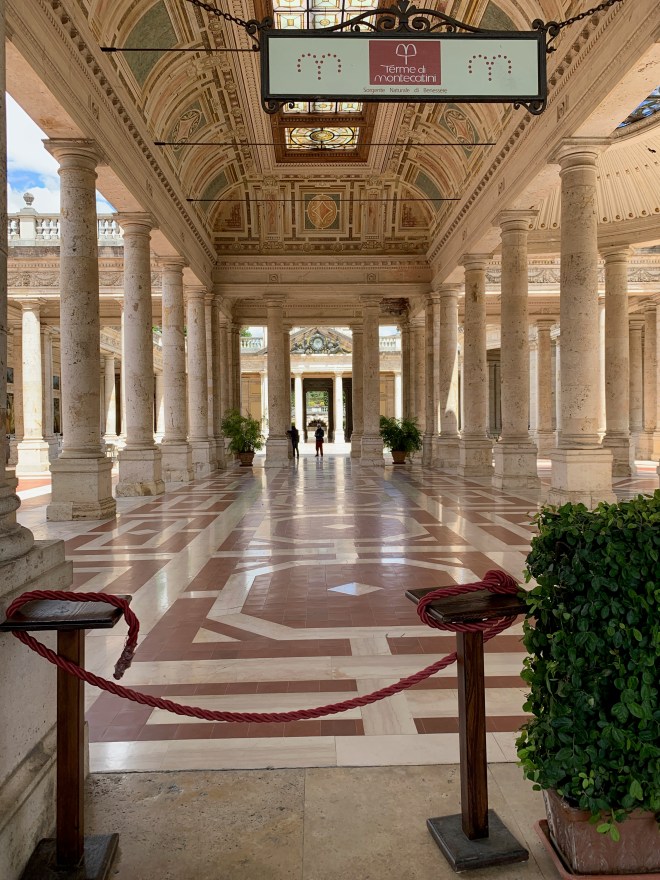 When Kelly asked about accompanying me to Italy, she mentioned going to Montecatini Terme, a Tuscan spa town about two hours by train from Bologna. I didn’t really know much about it, but I checked out the town’s information and found that the spa services, which include sitting in the thermal pools or drinking the mineral-rich water, are not very expensive. I booked the train tickets, and we set out early this morning for Montecatini.