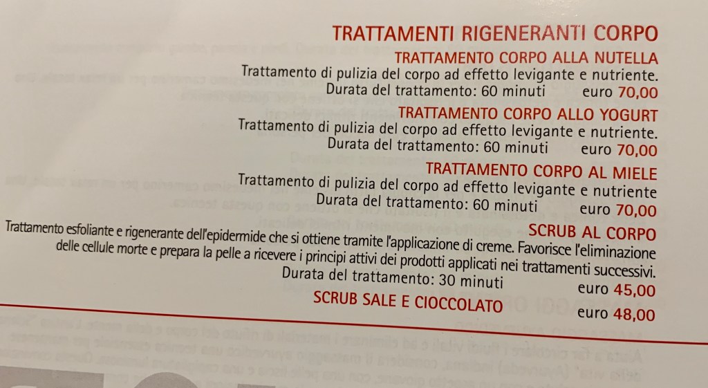 We walked into Hotel Columbia and looked at their list of spa services. You’ll note in the photo above that some of the treatments involve covering the body with honey, yogurt, and even Nutella to compact the muscles and leave the client with smooth skin. They also had pineapple, chocolate, coffee, and vanilla mud baths listed, but we had walked so much the last two days that I thought maybe the peppermint or seasonal fruit leg balms would be a better choice.