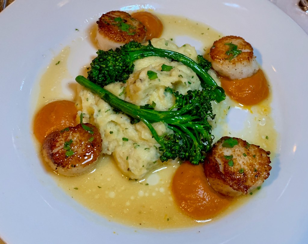 I ordered seared sea scallops served with potato puree, broccoli, and carrot puree. The plump scallops had a golden crust on both sides, and the meat itself was tender and buttery. The purees complemented the scallops perfectly without overpowering them.