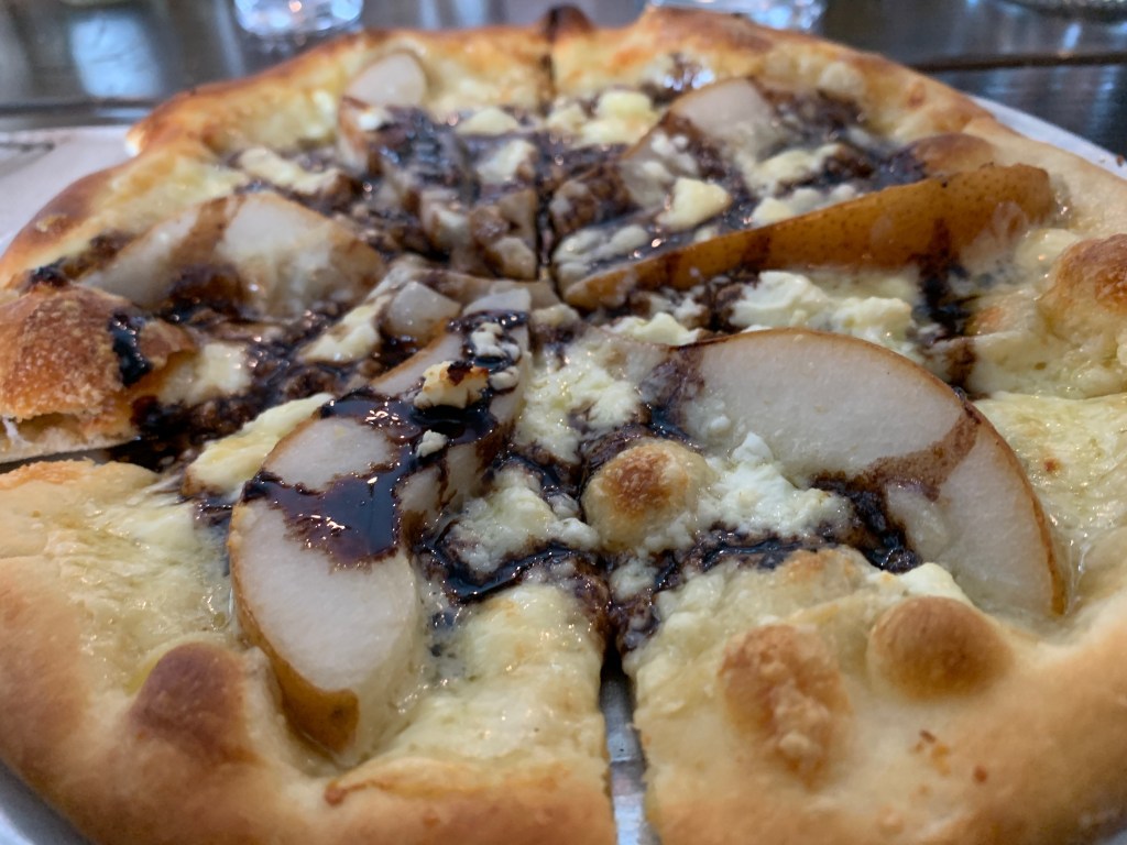 I chose the pear and goat cheese pizza. Drizzled with balsamic vinegar, the pizza offers a blend of sweetness and acidity that are more than pleasant. The crust—light and crisp—brought everything together. I liked the pizza so much that I tried to duplicate it at home. I came close, but my crust was not as good as theirs.