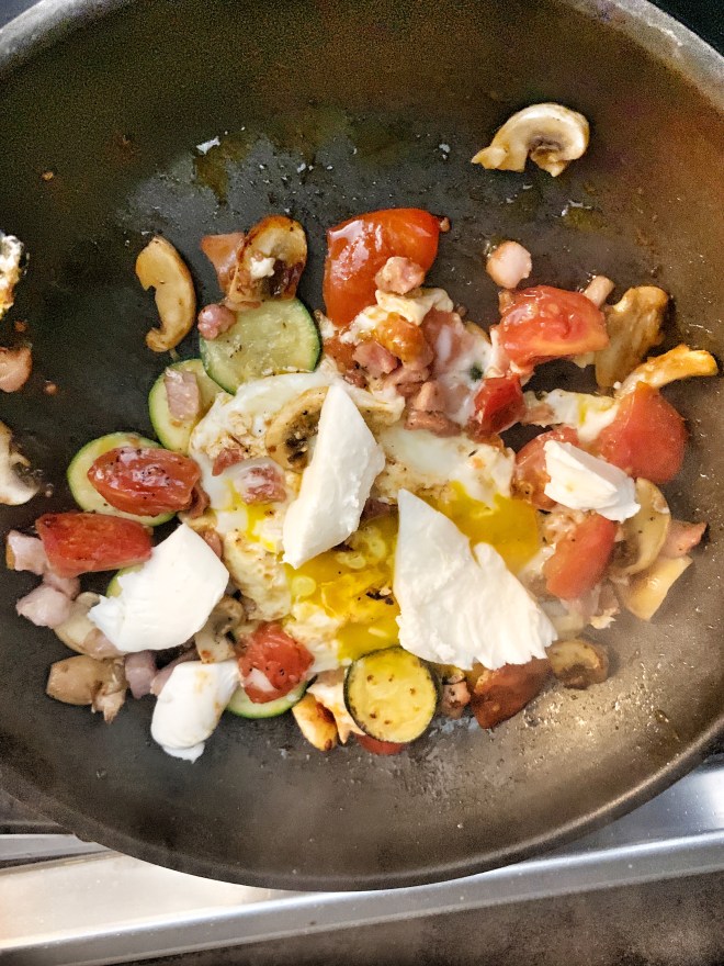 Today, for example, I’ve been craving eggs, and since the markets here sell eggs in packages of two, four, six, etc., I bought two the other day. I also bought a few tiny tomatoes, zucchini, a mushroom (yes, one), and a little diced pancetta.
