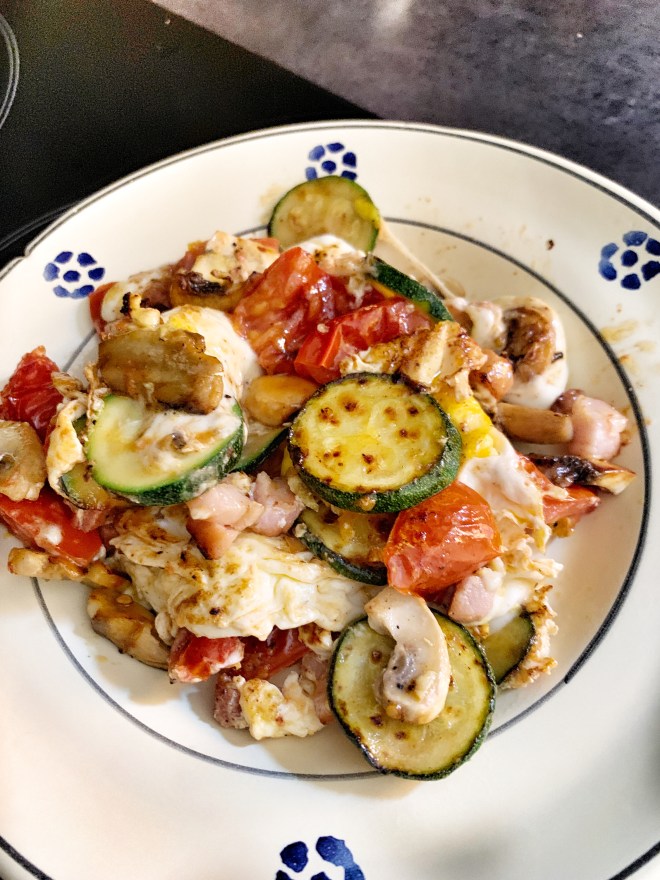 I chopped the tomatoes and sliced the mushroom and zucchini and sauteed them in a little olive oil.