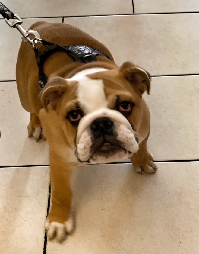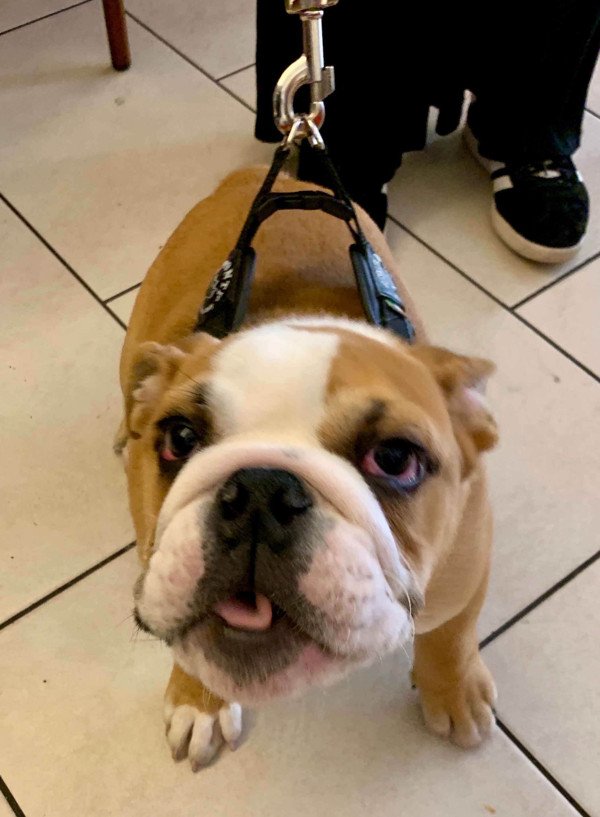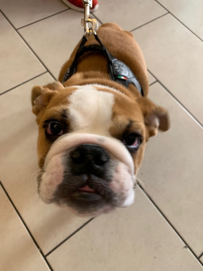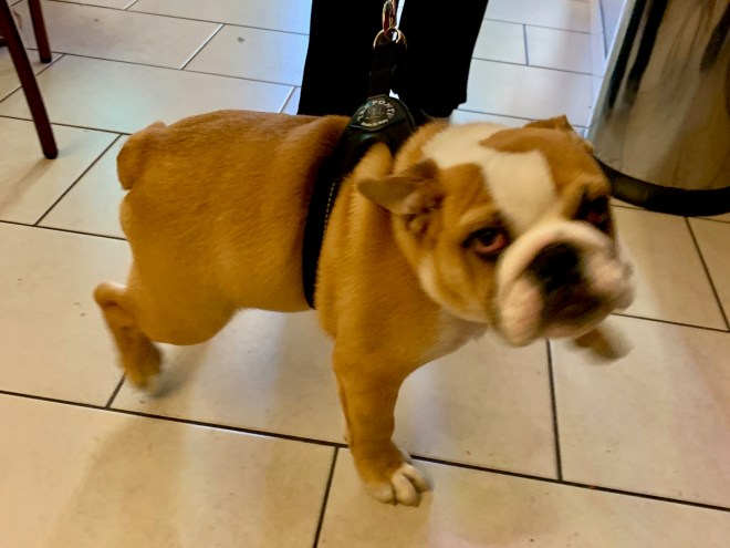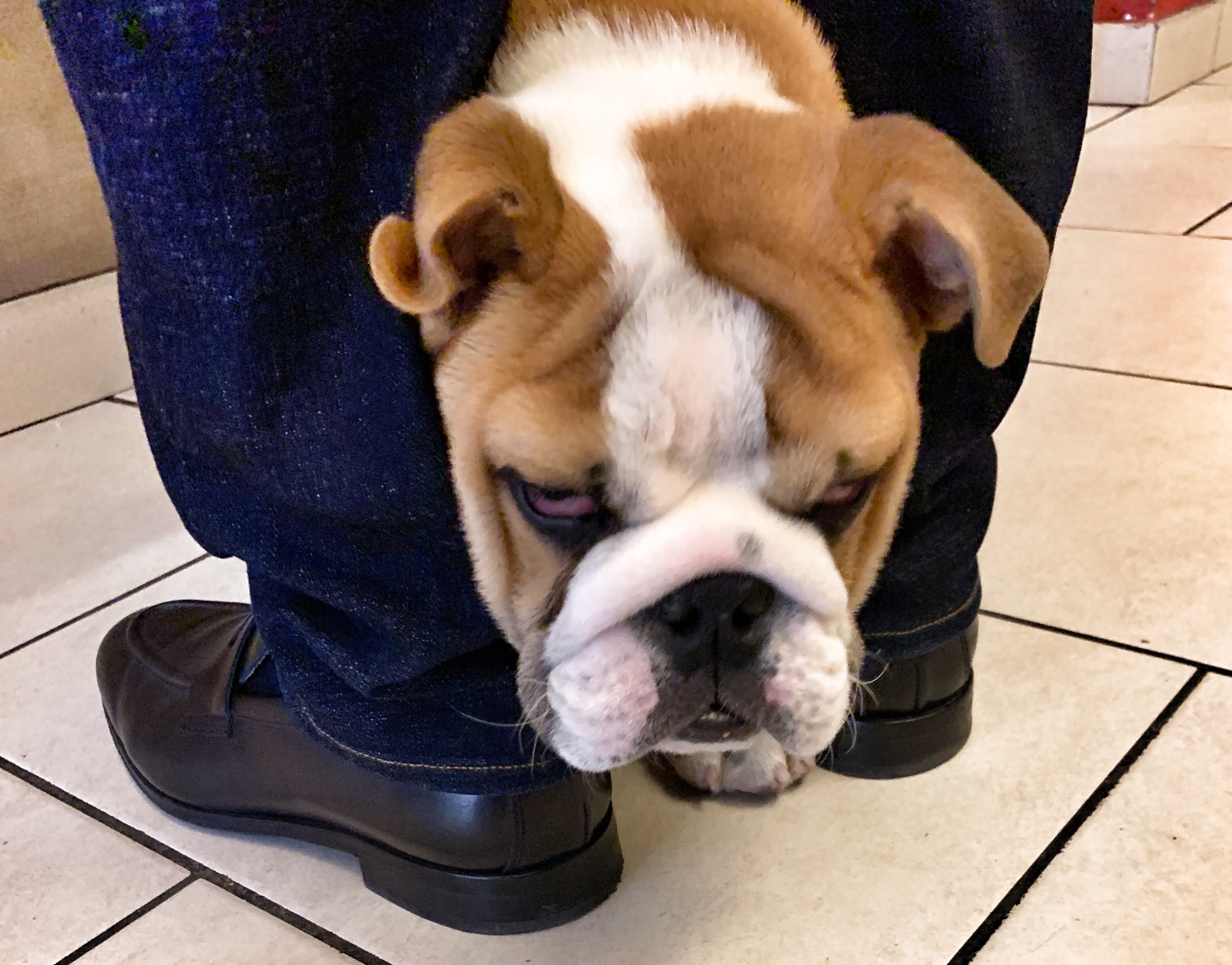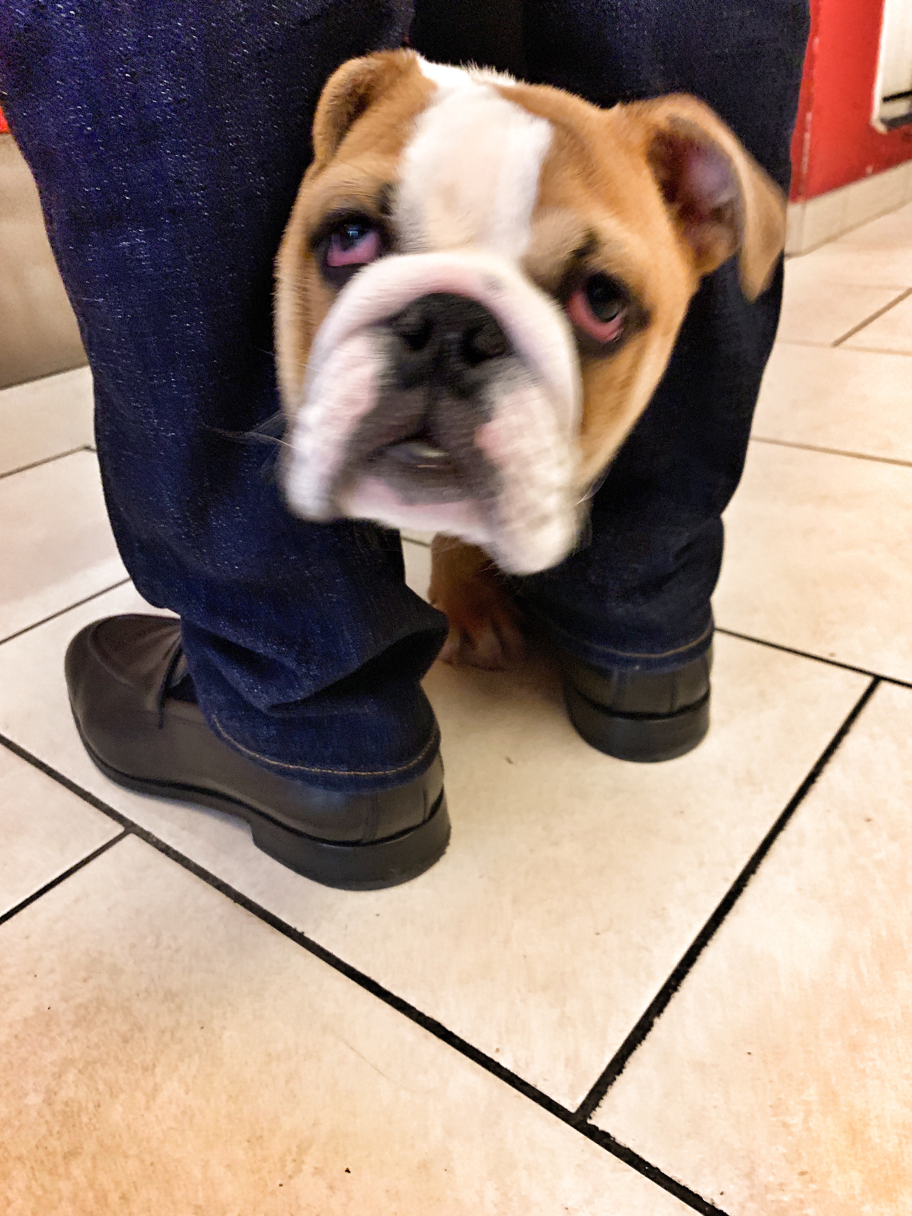 Cooper is a three-month old English Bulldog who joins his humans at the bar every morning. He is a little clown who plays hide-n-seek with me (two left photos), sticks out his tongue (right), and wiggles his little butt around constantly. “They named my car after you,” I tell him, and he twirls around in circles. This morning, he tried to eat the Italian flag off of my Crocs and was not happy when I walked away.