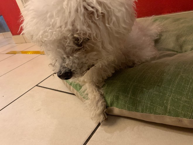 I’ve introduced you to Marte before as he belonged to my dear friend, Leda, who passed in December. Lili and Cesare adopted Marte as Leda had no children, and Marte now spends some of his day on a bed at the back of the bar. He is a Bolognese, a bichon-type breed that originated in Italy. Mr. Marte, who celebrated his 19th birthday last Saturday, is looking a little healthier since I last saw him.