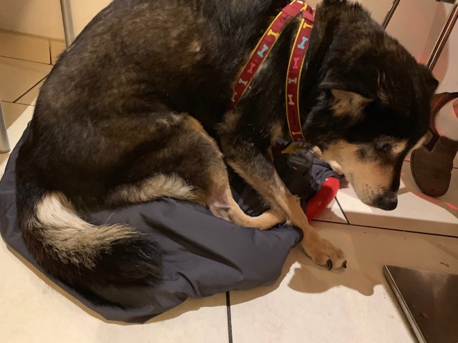 When I returned from Florence two weeks ago, I took this photo of this wonderful 19-year old dog that I had seen in the bar most mornings. Her owner put her own coat on the floor so the dog would ave something comfortable to lay on. My heart broke this morning when the woman came in alone and said the dog died in her sleep yesterday. “She was such a sweet dog,” the owner said.