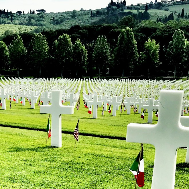 Since it is Memorial Day Weekend, let me start by telling you that there is an American cemetery in Florence. Located seven miles south of the city center, the cemetery sits on 70 acres surrounded by wooded hills. There are 4393 resting there, and there is a marble Tablet of the Missing listing the names of 1409 soldiers missing-in-action. Most of the men buried in the cemetery died in battles after the capture of Rome in june 1944 and before the surrender of the Germans in May 1945.