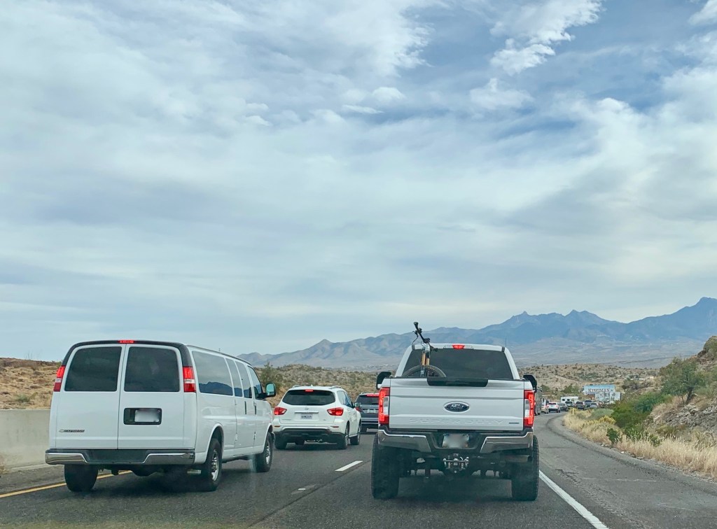 As we headed into Kingman, Arizona, he woke up because I slowed the car down quite a bit due to bumper-to-bumper traffic. He stood between the two seats and put his head on my shoulder as we slithered along with the rest of the cars and trucks heading into downtown Kingman.
