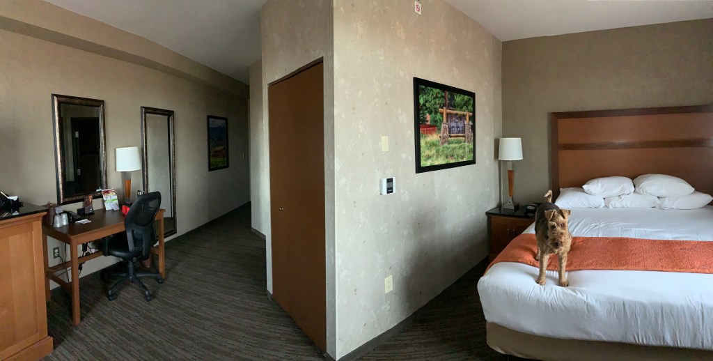When we finally got to the hotel, he was a wild man. This place has popcorn and soft drinks for guests, and I’ll just say that maintenance won’t have to clean up much of the popcorn that people dropped on the floor today. Once in the room, he ran from the door to the bed to the chair and around again.