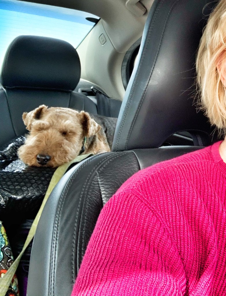 Apparently bored, he decided to sit on the console for a bit. I am not wild about that, so I tried to get him to sit on his bed. He was NOT having anything to do with it. He sat on the front seat again for a bit, and then hopped in the back and got very quiet. A quiet Riley is not always a good thing.