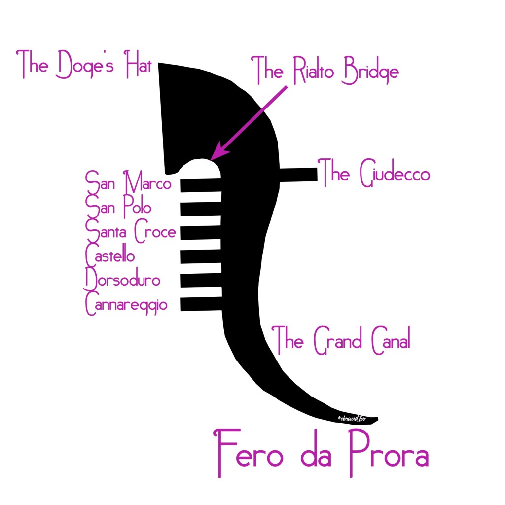 The “s” shape of the ferro symbolizes the curve of the Grand Canal while the six forward prongs represent Venice’s six sestieri (districts) and the one backward the Giudecca (the southern-most island that faces the sestieri). The curve above the prongs “is” the Rialto Bridge, and above it, the large curvy “head” of the ferro represents the doge’s hat.