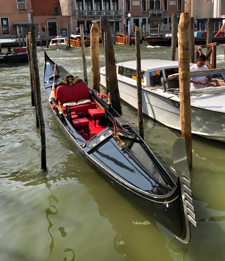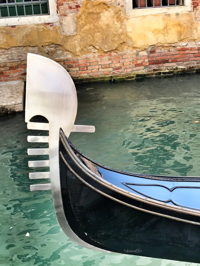 At one point, the well-to-do families competed with each other to see who had the brightest color or most gold on his gondola. In 1562, the Venetian government passed a law to limit “conspicuous consumption,” and they ruled all gondole must be black. The law has stuck for almost 500 years. (Side note: Red is the color of mourning in Venice while black is the color of elegance.)