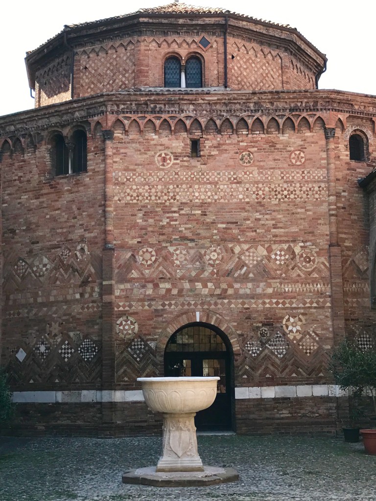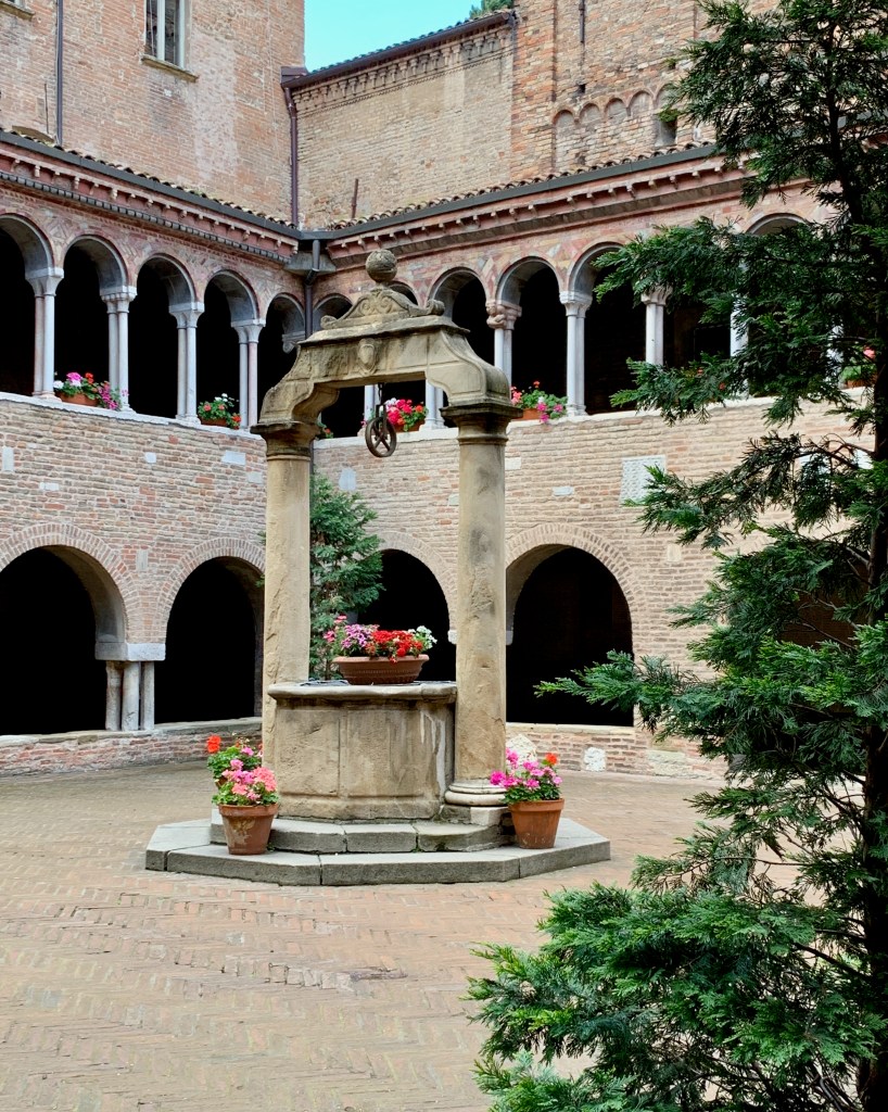 I don’t want to get into that, but churches do intrigue me. Up the street from where I live when I’m in Bologna is the beautiful Piazza Santo Stefano. Anchoring the triangular-shaped piazza is the complex of Sette Chiese di Santo Stefano, the Seven Churches of Santo Stefano. Legend has it that St. Petronius, patron saint of Bologna and former bishop, wanted to create a church that represented the passion of Christ and the holy sepulchre in Jerusalem. He ordered the church built on what was once a Roman temple of Isis. If you look at the cover image above, you can see three of the remaining four churches—the main church, the Church of the Crucifix (right) and the Church of the Holy Sepulchre (the round one on the left).