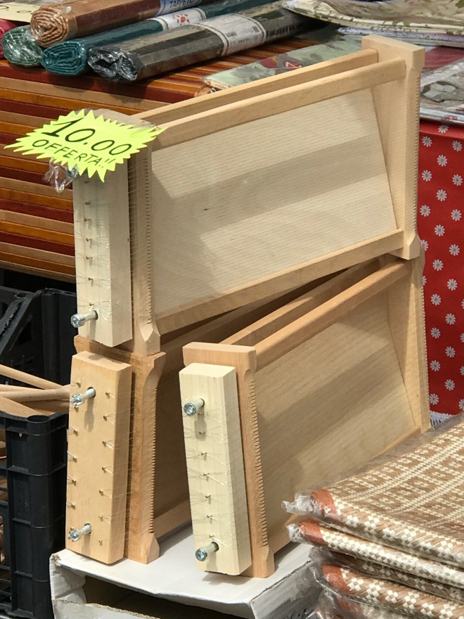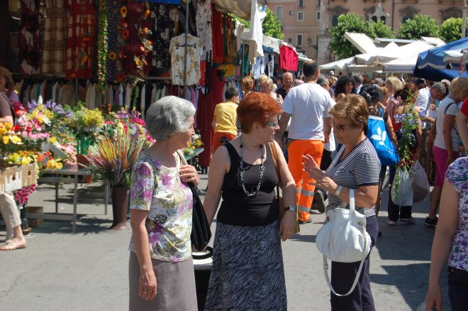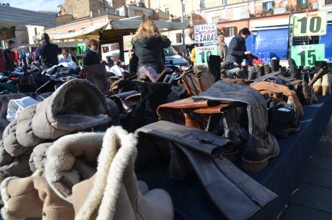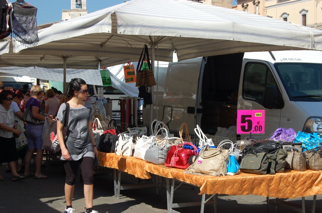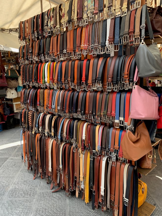 If the vendor insists something was made in Italy, don’t necessarily believe it. I can’t tell you how many times I’ve bought a scarf that was MADE IN ITALY, and I know that it wasn’t even though there was a tag ironed onto it that read, MADE IN ITALY. I was looking at scarves in one booth in Florence two years ago, and I saw one identical (IDENTICAL) to one I had just bought in the US. The vendor insisted it was made in Italy, but the one I had bought was made in China (aka PRC). Another time I was looking at scarves at a different booth, and I saw one with the MADE IN ITALY tag ironed on the side opposite the MADE IN PRC tag. I’m not saying everything in the markets is not made in Italy, but you never know.