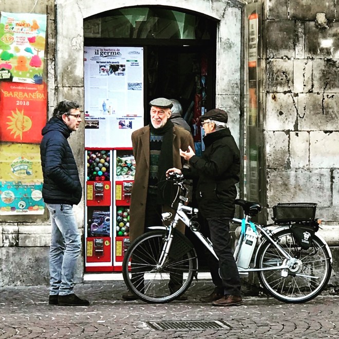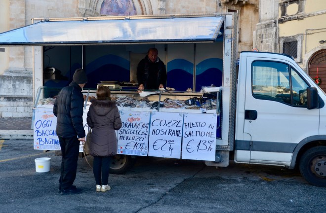 Market vendors do not accept credit cards. Actually, Italy is a mostly cash-based society, and except for big-ticket items, you’re better off paying cash most places. It’s always good to have a variety of money, including coins. I invited the wrath of a vendor (below) one day because I gave him a 5 euro bill to pay for 2 euro worth of tomatoes, squash, and pear. He wanted moneta, aka coins, which I did not have, and I can tell you he was not happy with me.