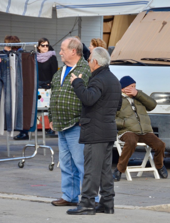 You’ll also notice that while the women shop, the men get together and talk. My husband has a theory that the men always converse in odd-numbered groups of three or five. It’s usually true. If you see two men together, another one will often walk up and join in the fun.