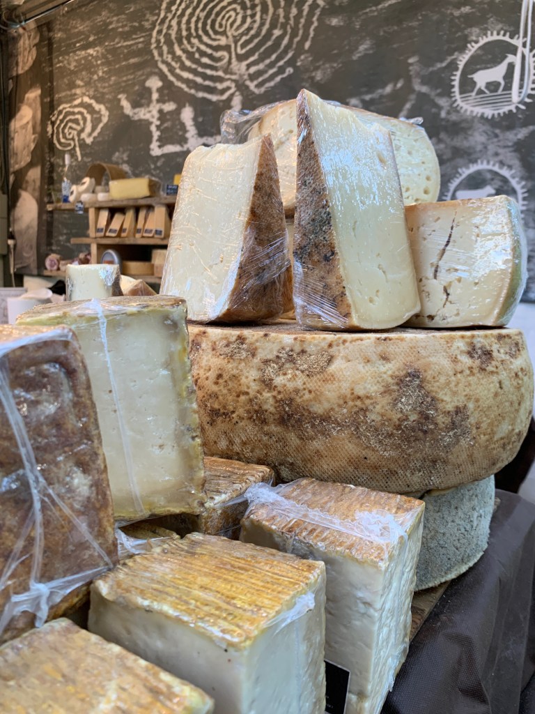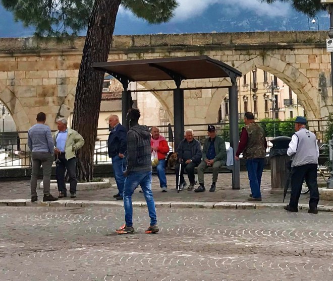 Sulmona, which holds its market in Piazza Garibaldi, has one of my favorite markets because that market has everything. I bought a chitarra (below L) there because I want to use it to make pasta. I could have bought one in the States, but this one was only 10 euro and not $40-70, and some Italian guy made it. I like that. I also like the porchetta (por-KET-a) at the Sulmona market (below R). Porchetta is roast pork that is simply to die for.