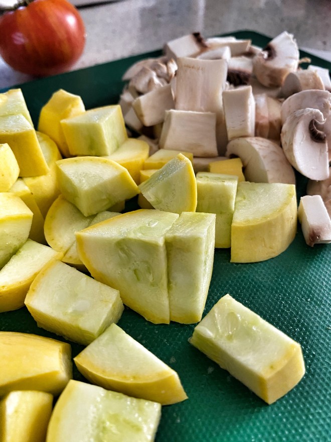 When I was a child, my mom often made a vegetable stew of bounty from the garden. She included tomatoes, onions, peppers, and zucchini mostly, although she would add carrots, potatoes, corn, and other veggies that she had. I hated it because she overcooked it to a soggy mix, but my father liked it. It was the last thing he ate the night before he died. Mom never made it again.