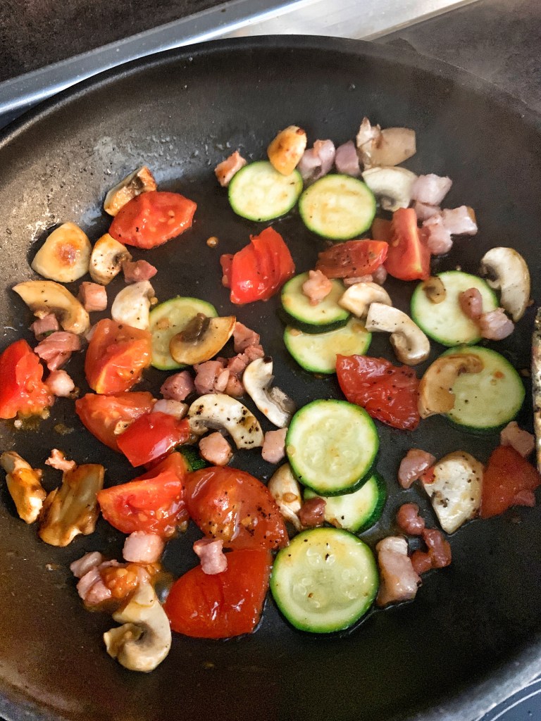 • Instead of using olive oil, I have browned pancetta (an Italian bacon) and cooked the vegetables in the pancetta and drippings. (This is common in the eastern Abruzzese province of Teramo.). (Photo above)