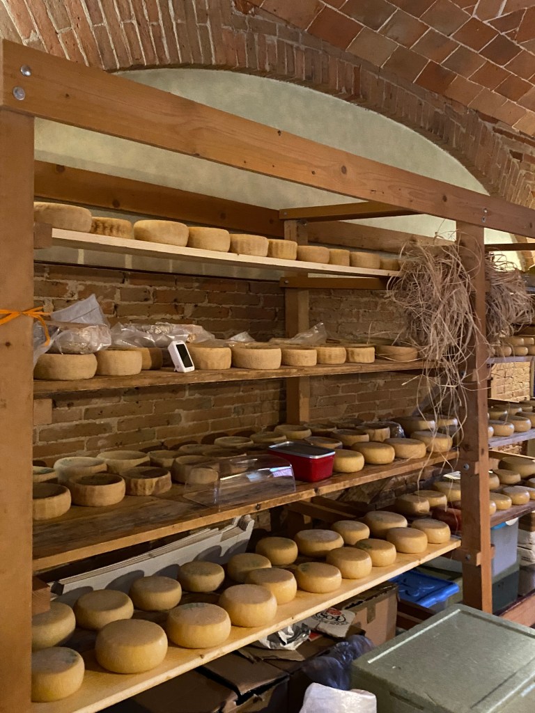 Our tour began with Francesco sharing the back story of the farm and its cheesemaking operation. We were intrigued by the family history. Francesco’s grandfather, a shepherd since age six, and his grandmother, a cheesemaker, started the farm together in the 1970s when the 47-hectare property, a former brickmaking facility, came up for sale. His grandparents kept the old brick kiln, renovated it, and now use it as an aging house to produce a unique cheese that is similar to cave cheese.
