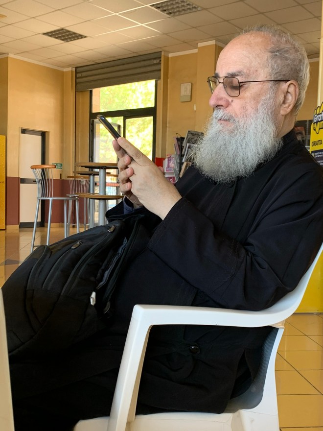 After lunch, Padre fiddled with his cell phone (He may or may not have been playing “Psalms With Friends”). When his bus arrived, he pulled his backpack from his lap, stood, and wiped the crumbs from his lap. “Grazie mille,” he said, again. “God bless you.” Mike handed him 20 euro. “For you or to help out,” he told Padre Nilo. The priest thanked us again.