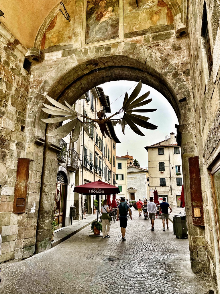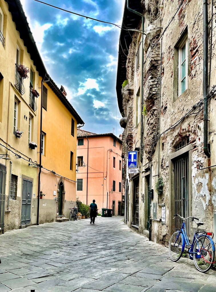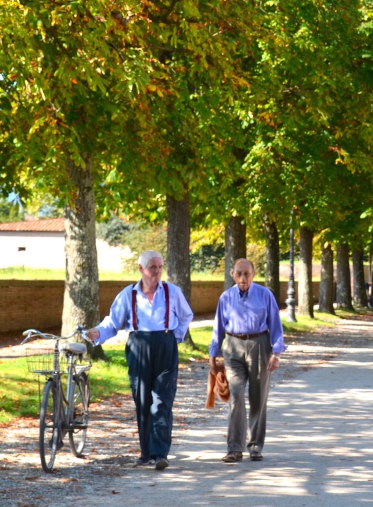 If I were to live in Tuscany, I’d choose Lucca. Located between Pisa and Florence, Lucca is a bustling, beautiful town. Its Renaissance (16th- and 17th- century) ramparts encircle the historic city center and have broad, tree-lined paths along the tops for strolling and cycling. You may remember that my bike and I had a bit of a disagreement two years ago, and I had to pick myself up from the tree-lined path.