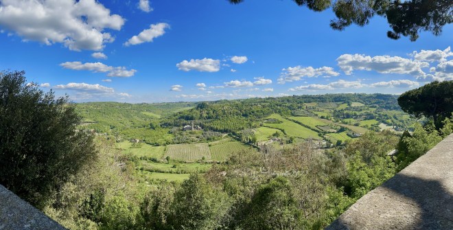 You may remember I spent two weeks writing in Orvieto last May. The town sits on a tufa hill overlooking the Umbrian countryside. Besides its cathedral, Orvieto has Pozzo di San Patrizio (16th-century well shaft with a double spiral staircase), an underground network of caves and walkways used in medieval times to escape the city during wars. A funicular takes you from the lower, newer city to the historic town center.