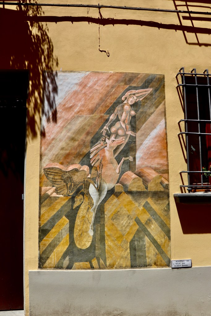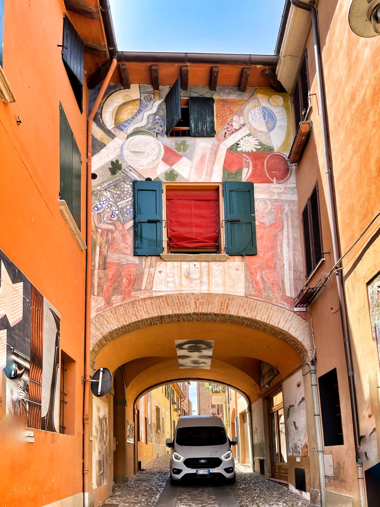 You probably have not heard of Dozza, the small hilltown about 30 miles from Bologna. This wonderful medieval town has a beautiful castle with an enoteca in what used to be its dungeon. It might take 10-15 minutes to walk from one side of the town to the other, and during that time, you’ll see Dozza’s real attraction on the walls of the town. In 1960, the town established the Biennale del Muro Dipinto (Festival of the Painted Wall). Held during the third week of September in odd-numbered years, the festival brings artists from all over the world to create art on the walls of the town’s buildings. Dozza is one big open-air museum.