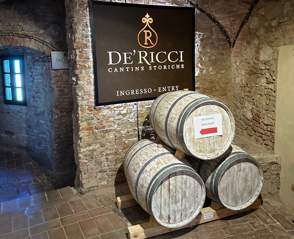 I’ll write about DeRicci Cantina at some other point, but suffice to say we took a tour of the underground and then had a tasting of six of their wines. The underground cellars are dramatic, and one resembles a “cathedral” due to its high ceilings and pillars. Its oldest part is the round, Etruscan cellar which has a well at the center.
