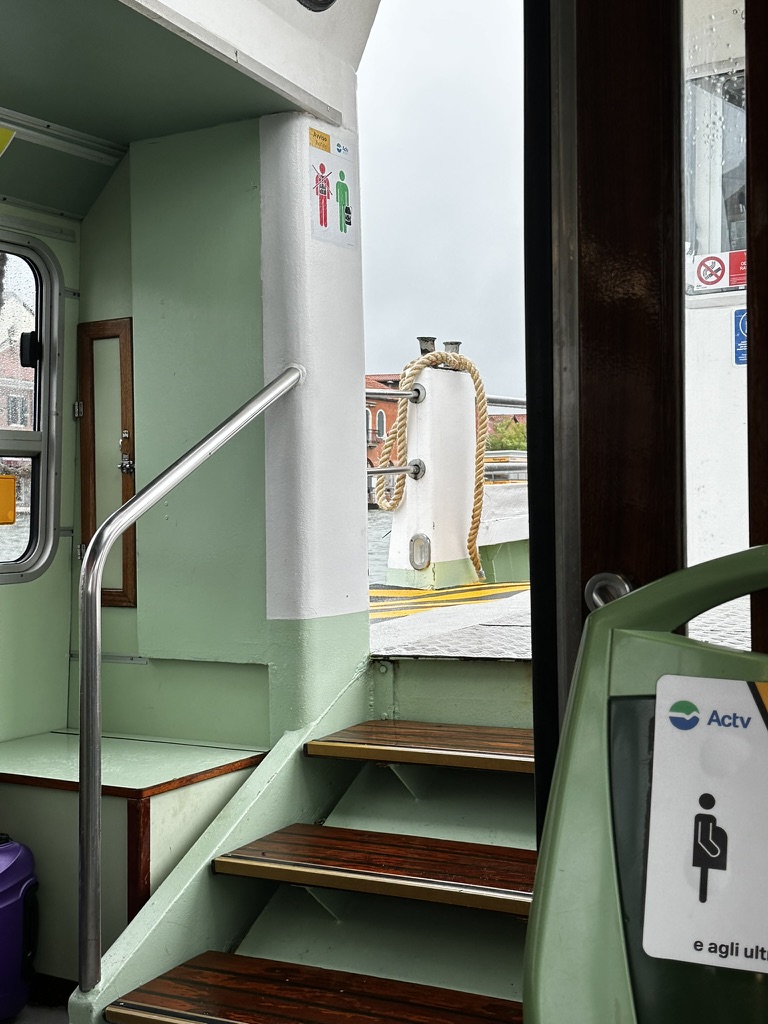 By the time the train arrived in Venezia, what had started as a light rain was a downpour. I waited in the station for about 30 minutes until the rain let up and hauled my bags down the steps to the vaporetto (water bus) stop. I bought my ticket, put it away quickly, and headed to the vaporetto that the woman told me to take. Because of the rain, the boat was quite crowded, and those of us with luggage had to stand in a well at the bottom of the steps.