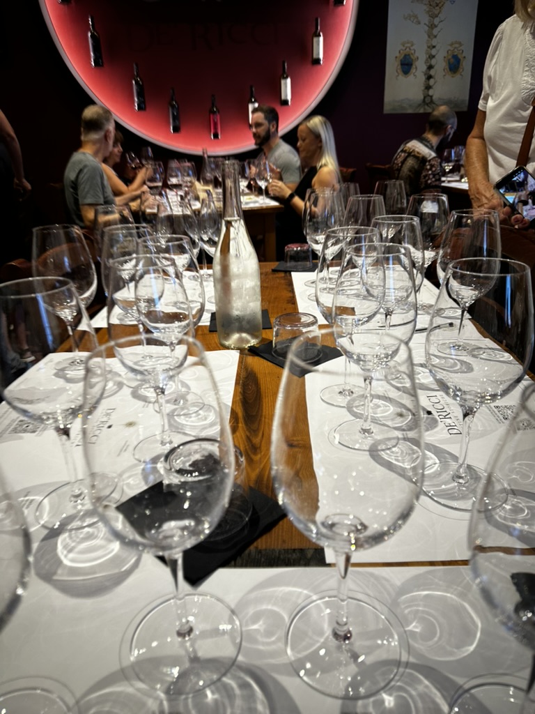 As you might imagine, someone who doesn’t like crowds is probably also not too thrilled about tight, windowless spaces. At the end of the tour I was itching to get to the tasting simply because I wanted out of that underground. Usually tastings are pretty quiet, private affairs, but DeRicci offers them to multitudes of guests at once. Each group has its own table filled with three or six empty glasses depending on which tasting it has bought. We had the six-glass tasting.