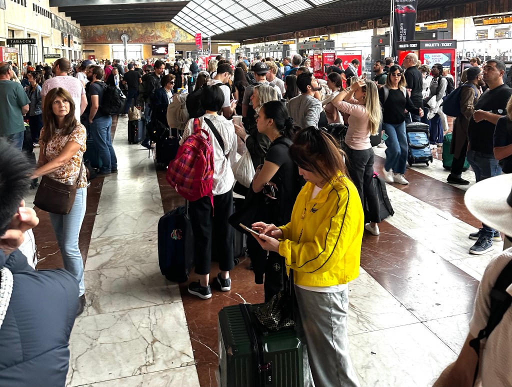 “Let’s take the next train,” I said. Even that turned into an ordeal because we then had to fight to have people make room to let us off. One guy in particular had positioned his suitcase right in the doorway, and he would not move it so that we could get ourselves and our luggage off of that train. “MOVE THAT THING OR I’M GOING TO THROW IT OFF,” I yelled at him in Italian and then English. He would not do it, so I pushed my own bags into it so we could push past him. (I won’t repeat here what I said as I passed him, but you can imagine it was not the most polite thing I’ve said in my life.)