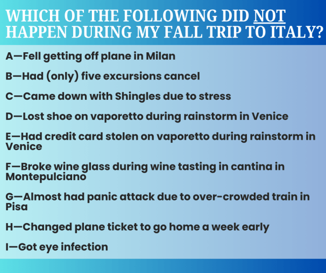 It’s been a few days since I posted the “quiz,” and no one has correctly guessed the answer. I threw in a ringer (A—Fell getting off the plane in Milan) because that happened in April, and I had mentioned it then. But, no, I did not fall at all during this trip. I think I deserve a medal for this alone since most of the flights I took included embarking and disembarking via stairs on tarmacs instead of walking onto jetways.