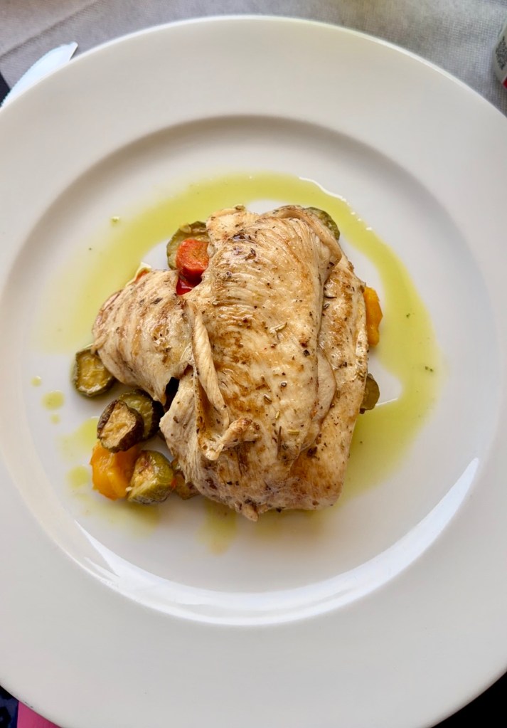 Even though we were in a tourist area, the restaurant’s food was fresh and cooked nicely. My chicken consisted of three thin slices piled on fresh zucchini, carrots, and peppers. I brought a lot of it back to Lucca with me, so I enjoyed it again the next evening for dinner.