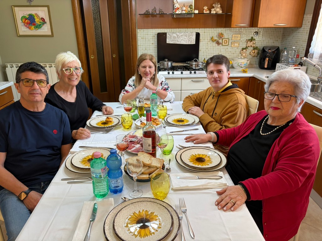 The best part of the day was meeting family. In addition to Davide and Lidia, we met Maria, Lidia’s mother who was married to Mario, Aunt Teresa’s grandson. We also met Enrico, Lidia’s husband, and Mario, a second cousin. Maria and Lidia cooked a wonderful lunch, and we talked and laughed about family and life. We compared photos of family and agreed that we Crugnale have a certain face shape. “You can’t deny blood,” Lidia said.