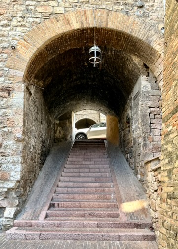 If you have never been to Assisi, I suggest you spend a day here. There is a special feeling here…. It’s a very calming town (even when 10,000 tourists invade it). I had wanted to come here for that reason….although I did forget that the place is one huge hill. Every time I walk out of the hotel door, I stop, glance left (uphill) and right (downhill), and try to decide if I’d rather exert the energy on the way out or on the way back. I usually turn left.